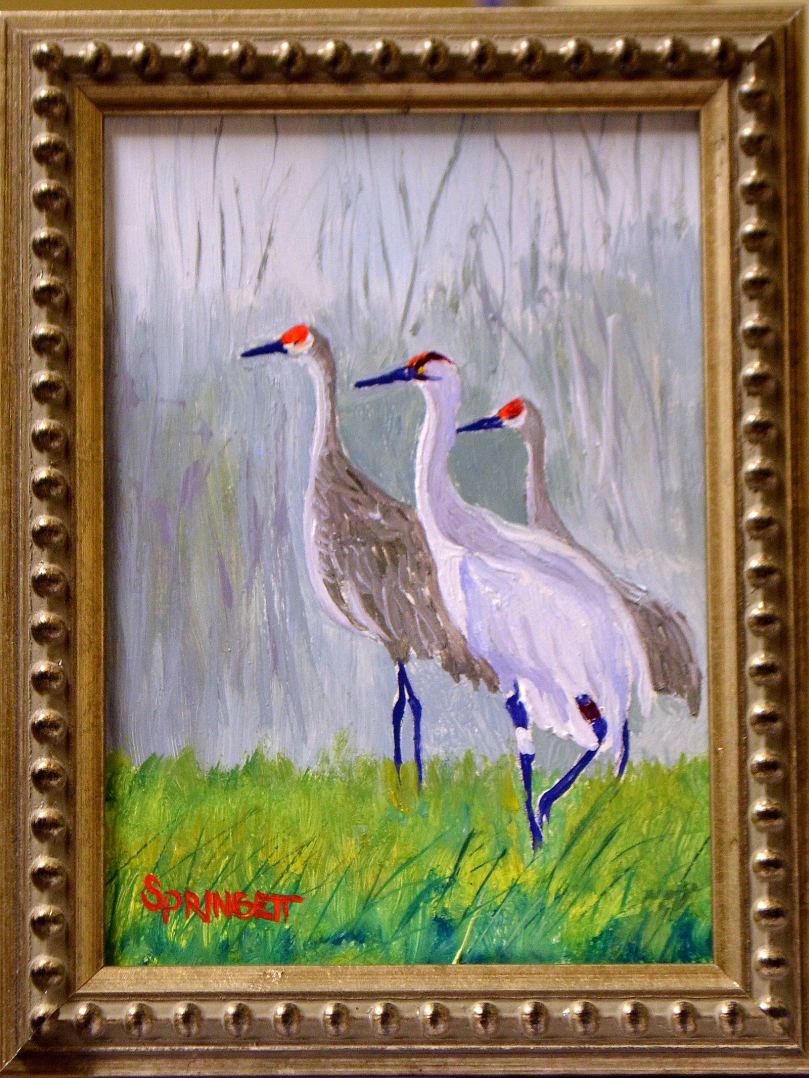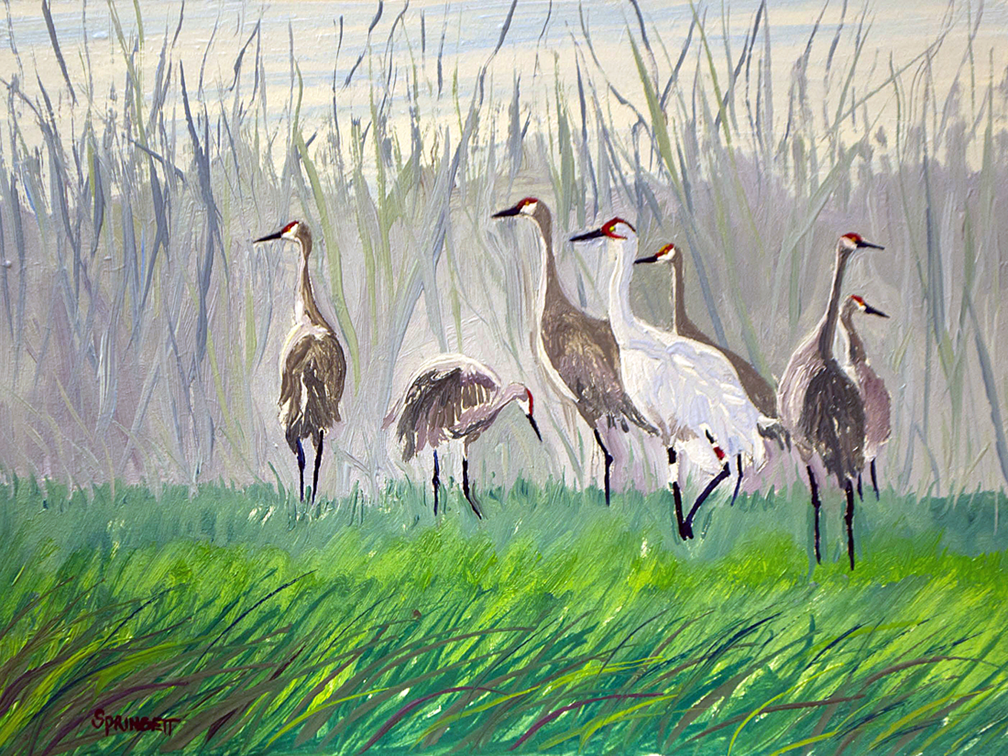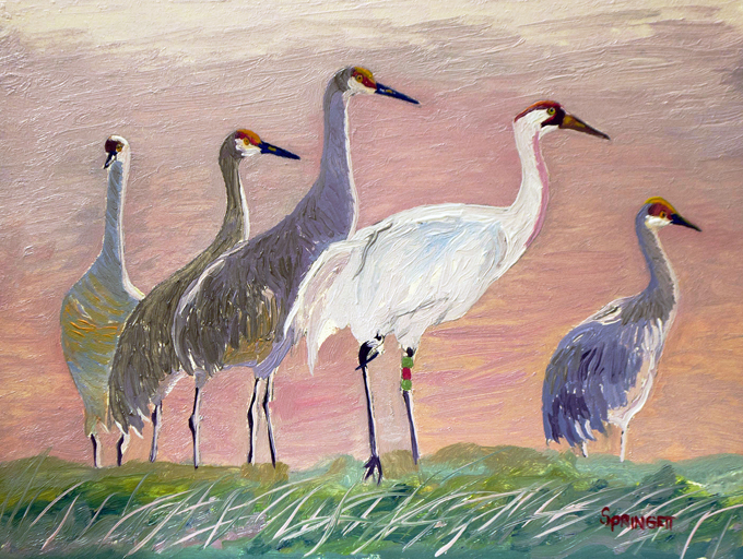 Great is the day when the cranes dance and show off, and on November 15, 2013 on a very special morning the whooping crane number 10-10 visiting our area with the sandhill cranes was looking on the sandhill in his special dance pose so I painted this painting to celebrate all life and dancing calling this painting ” Among Friends ” and hope you enjoy a great deal.